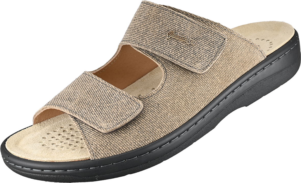 Diese Herrenpantolette lässt sich mit zwei stufenlos verstellbaren Klettbandagen optimal am Fuß anpassen.